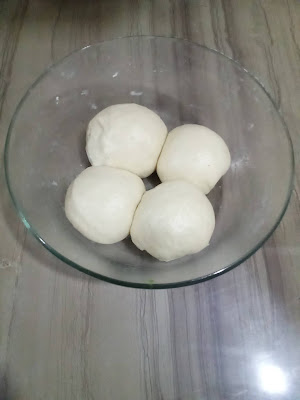 Once the dough has doubled in size, knead again. (2-3 minutes) Then, separate the dough into 4 balls